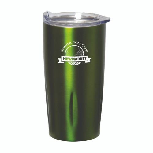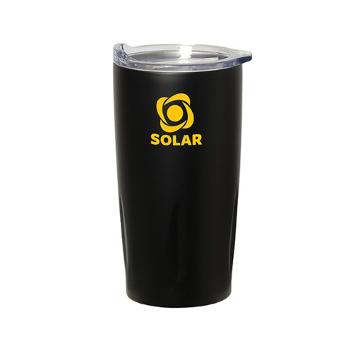 Stainless Steel interior and exterior. Double-walled with vacuum insulation to keep your drink hot or cold longer. Dimple-designed exterior. Clear Acrylic snap-on lid with Plastic sliding closure. For use with hot and cold beverages. Holds up to 600 ml. (20 oz.) Take your logo on the road. BPA-free and FDA-compliant. Packaged in our ugly, beautiful retail-inspired packaging.